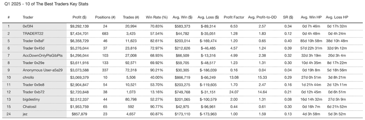 Their approaches differed significantly. Chatosil, for example, maintained a high win rate with a lower profit factor, whereas 0xb72 showed the opposite combination. Holding periods ran from minutes to weeks, signaling that consistency can arise from very different playbooks.