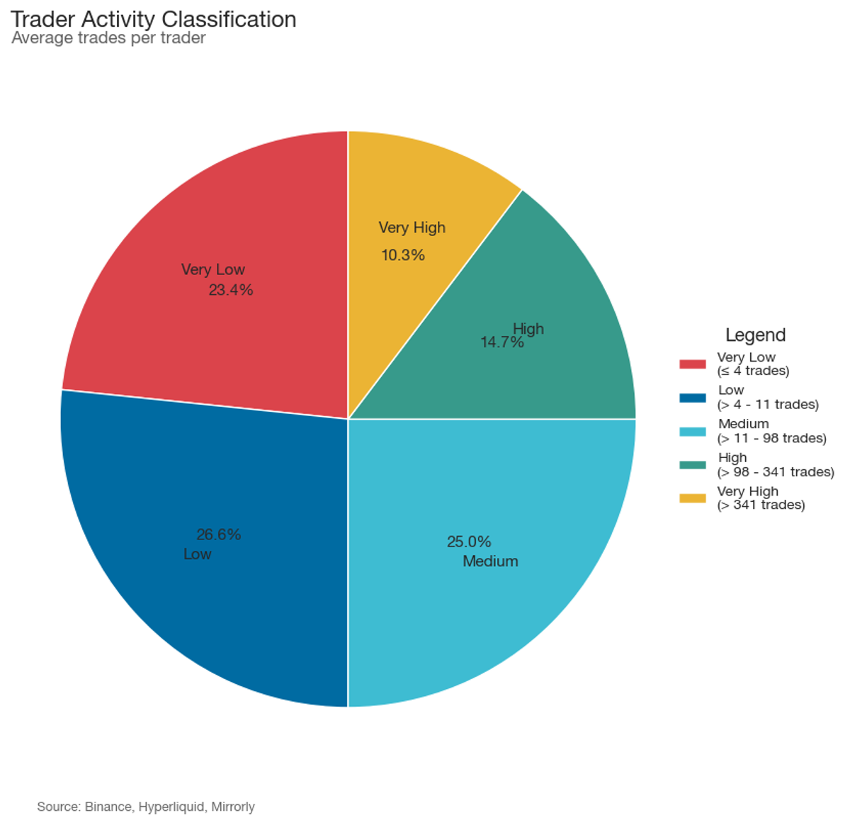- The remaining 25% exhibited much higher activity, with an average of over 98 trades per position.