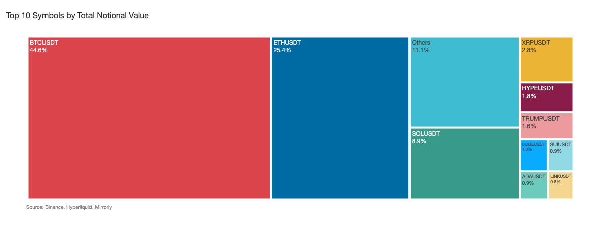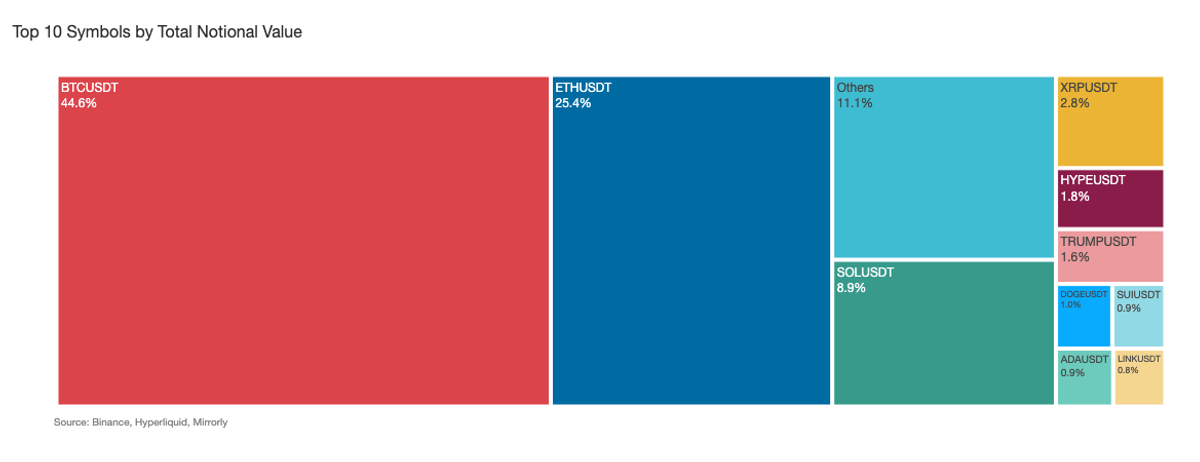 As expected, the three major large-cap tokens ($BTC, $ETH, and $SOL) accounted for approximately 79% of total notional trading volume. Outside of these, most of the remaining activity was concentrated in $XRP, $HYPE, and $TRUMP, with additional interest in $DOGE, $SUI, $ADA, and $LINK.
