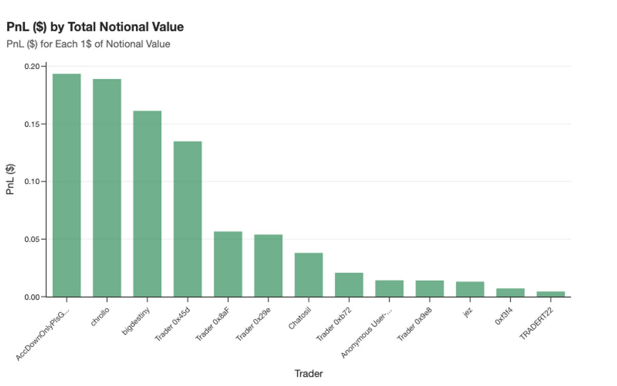 Profit per unit of exposure highlights the spread in style even more clearly. AccDwonOnlyPlsGibPts earned roughly $0.20 for every $1 of notional, translating into $4.3 million of profit. On the other hand, TRADERT22 generated a larger headline number ($7.4 million) but only after deploying far more capital, with a yield of about half a cent per notional dollar.