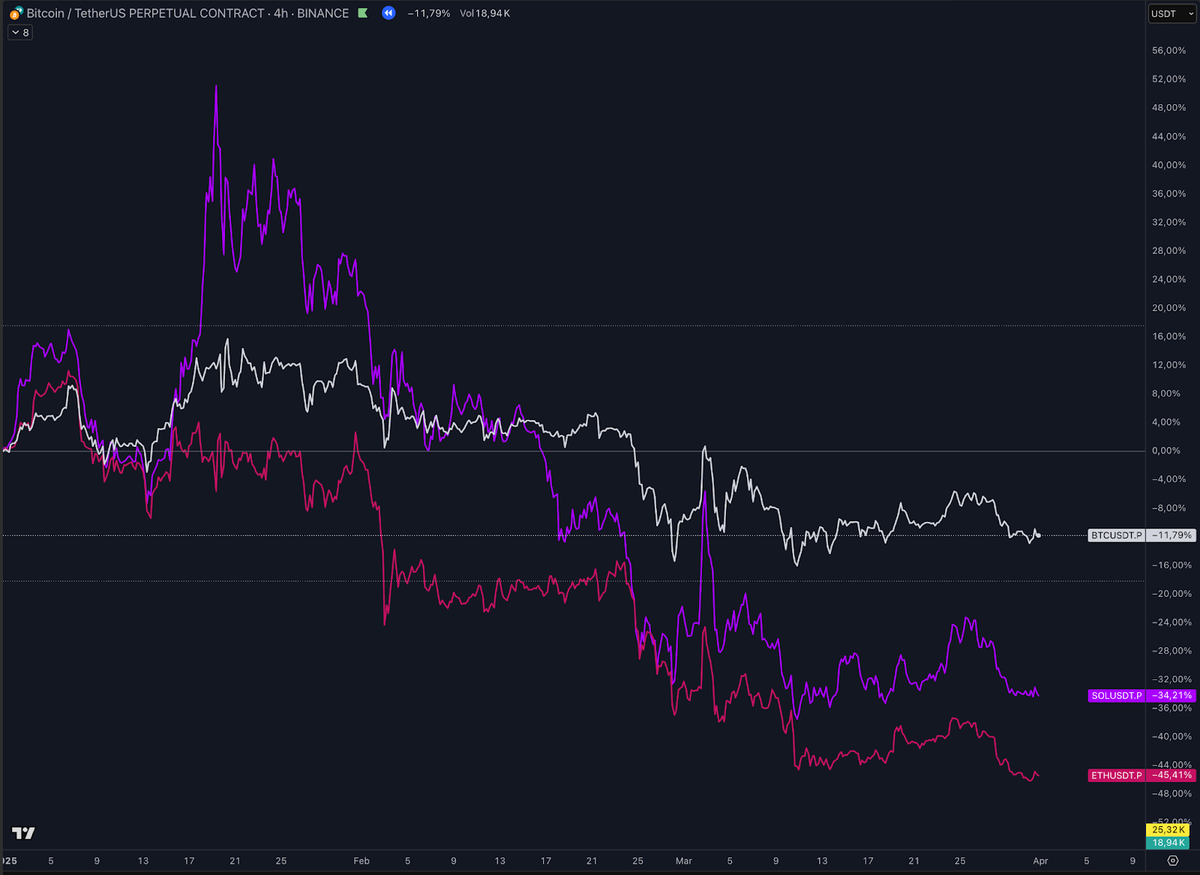 Q1 was challenging. From the January high to the March close, $BTC fell 11.8%, $ETH 45.4%, and $SOL 34.2%. Those moves set a demanding benchmark for anyone trading on the long side.