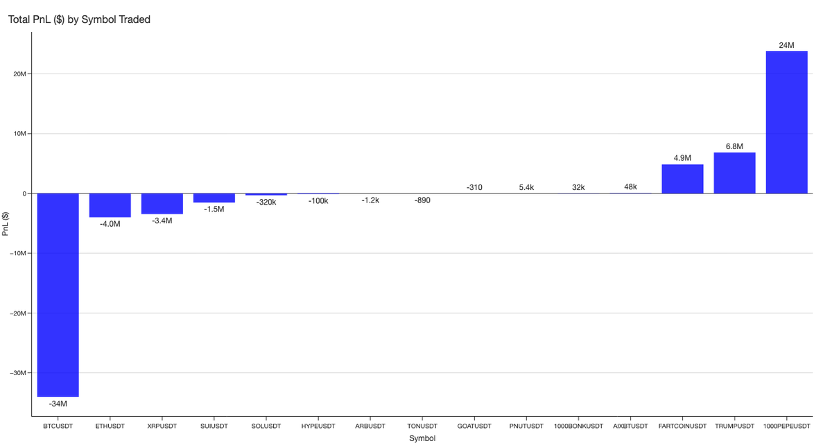 The focus on $PEPE and $BTC is further reflected in the total PnL by symbol: Wynn generated $24 million in profits on $PEPE, while accumulating $34 million in losses on $BTC.