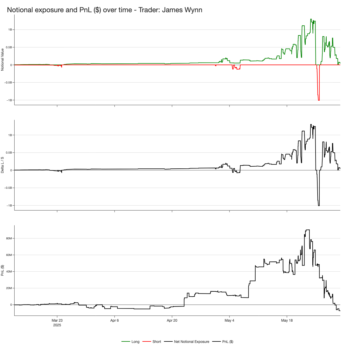Wynn began “slow” on Hyperliquid, trading with notionals in the low millions and keeping his PnL around breakeven through April. That changed at the end of the month with his first major win, pushing profits close to $20 million. From there, his exposure increased rapidly, ultimately reaching $1.3 billion by the final week of May.