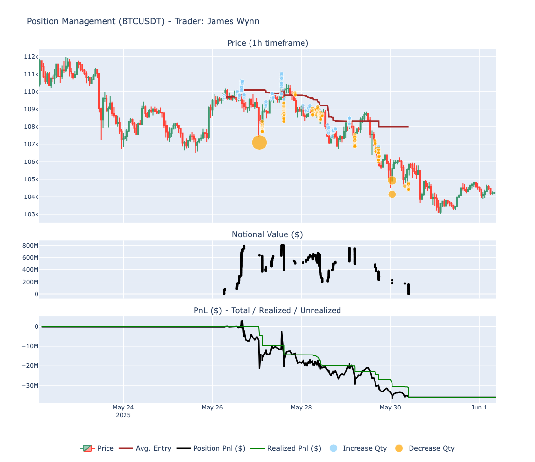 When $BTC began to reverse and approach $110K again, Wynn rebuilt the position back to $800 million, hoping for a second breakout attempt. But the level held once more, and the price began a steady decline toward $104K. Over the following days, Wynn actively managed his exposure—reducing it to $200 million, then scaling back up to $800 million—before finally closing the position entirely on May 30. The trade ended with a total loss of $36 million, which, combined with the previous $15 million loss, brought Wynn’s total loss across the two positions to $51 million.