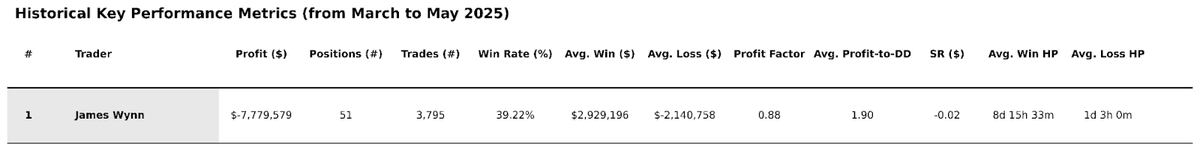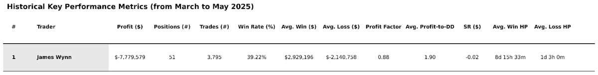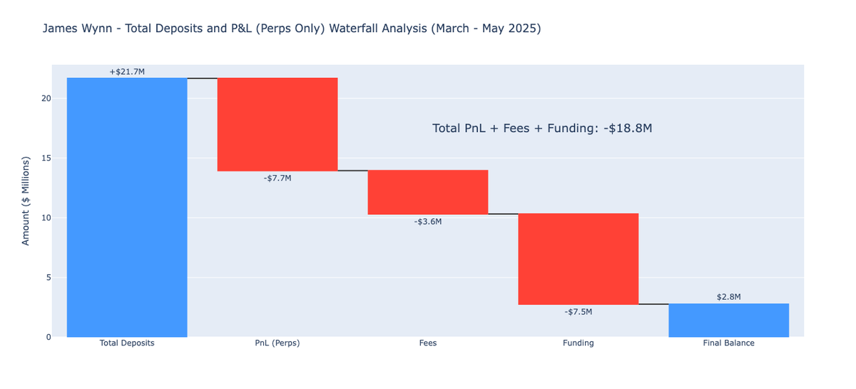 By the end of May, Wynn had lost approximately $18.8 million on perpetuals alone (factoring in PnL, fees, and funding) leaving just $2.8 million from the $21.7 million in total inflows.