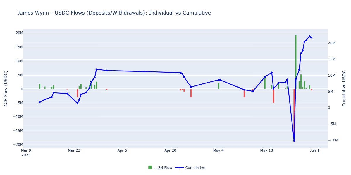 In March 2025, Wynn entered the Hyperliquid arena, depositing $4.65 million in USDC between March 13 and 17 to kick off a high-stakes campaign that would soon capture the attention of the entire CT community. Over time, the cumulative USDC flows, including both fresh capital and profit transfers, reached a total of $21.7 million.
