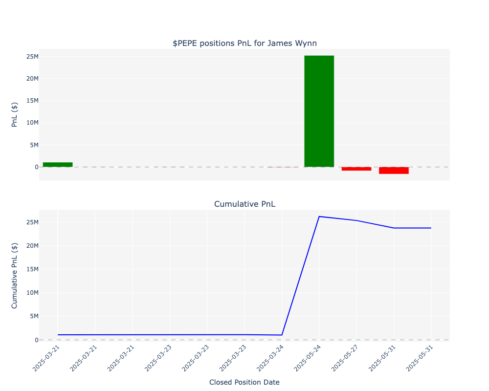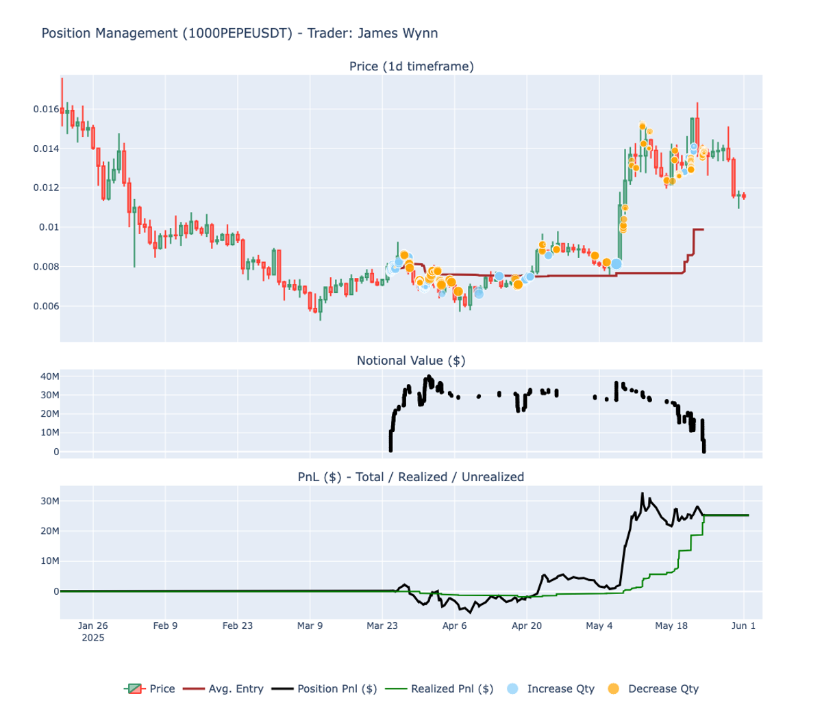 Wynn managed his $PEPE position for two months, from March 23 to the last week of May, effectively capturing the entire upward move the token experienced during that period.