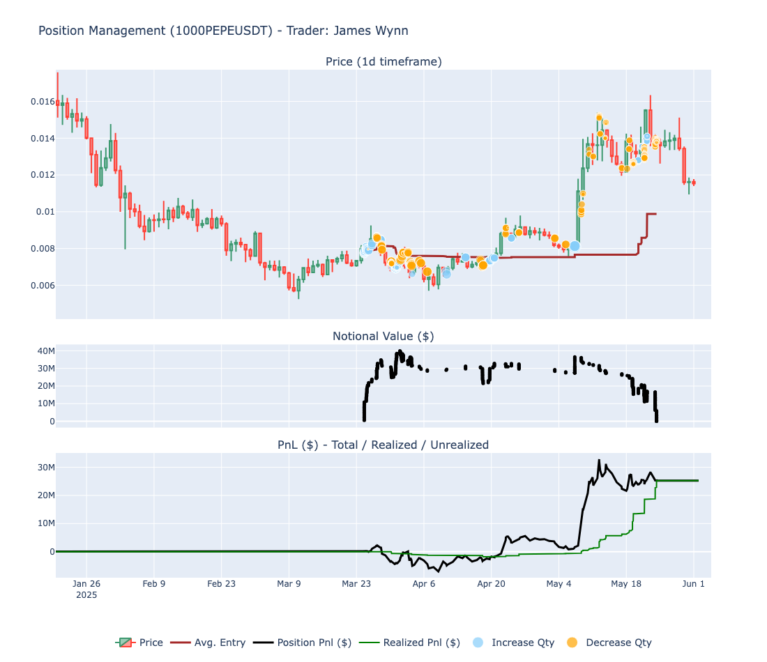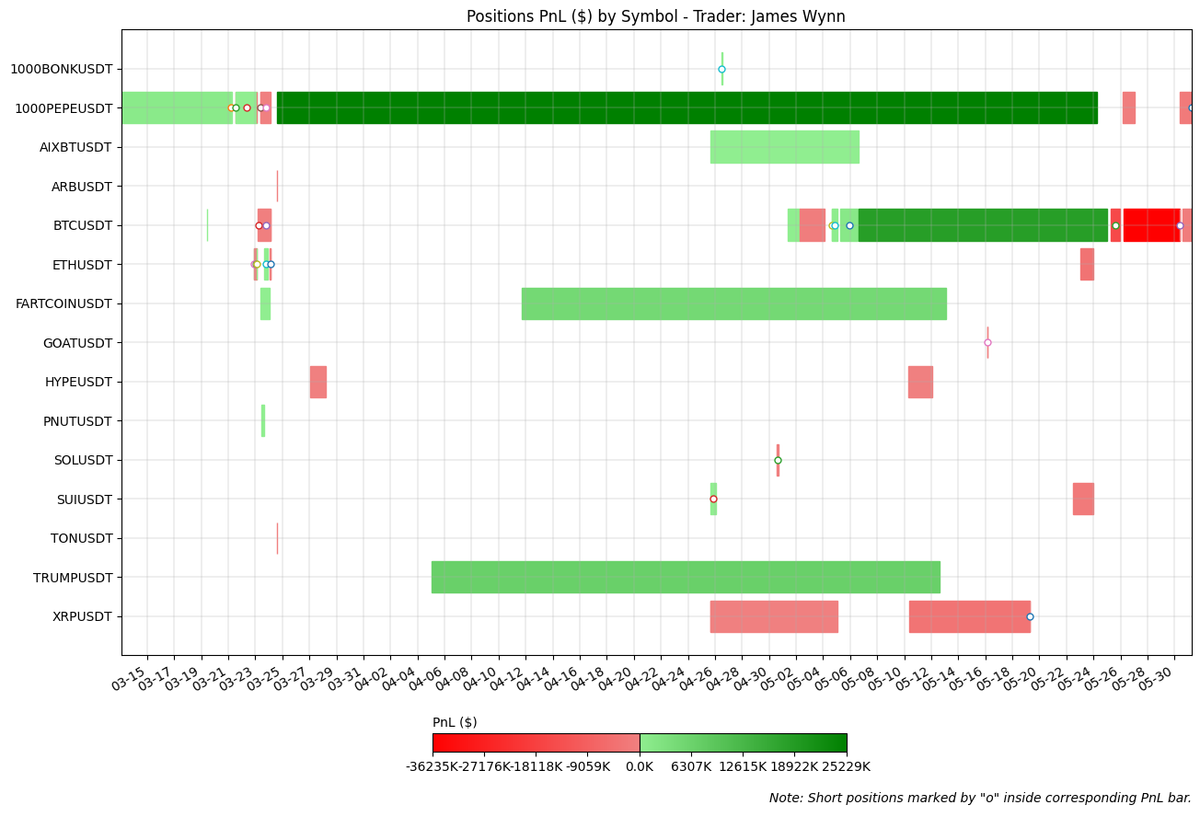 Wynn traded a total of 15 symbols, but his focus was primarily on $PEPE and $BTC: the former throughout the entire period, and the latter becoming his main exposure from the end of April onward.