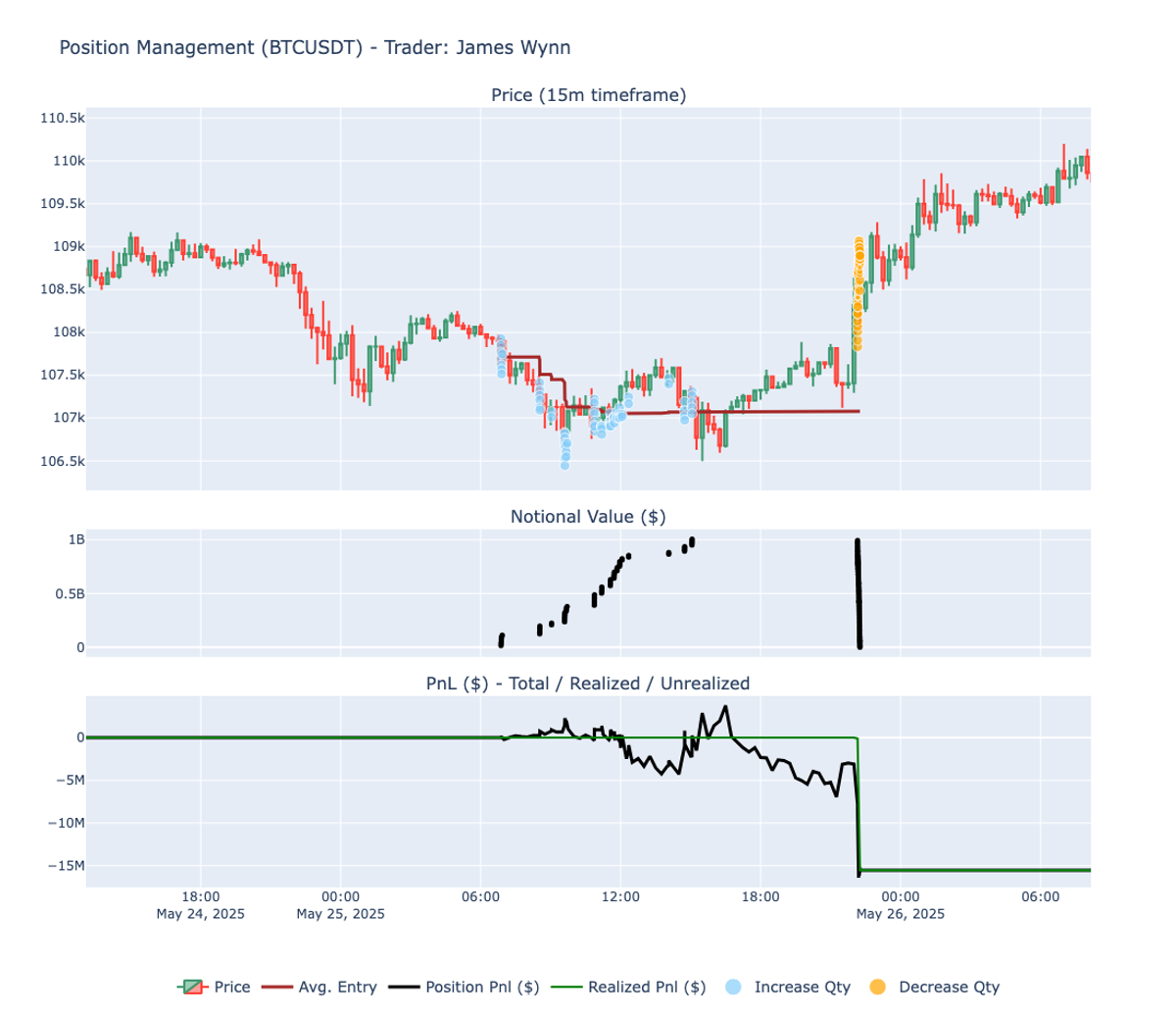 The average entry price (red line) shows a gradual upward slope, indicating that Wynn was continuously adding to his position at higher price levels. His entry remained below the prevailing market price for most of the trade, reflecting early profitability.