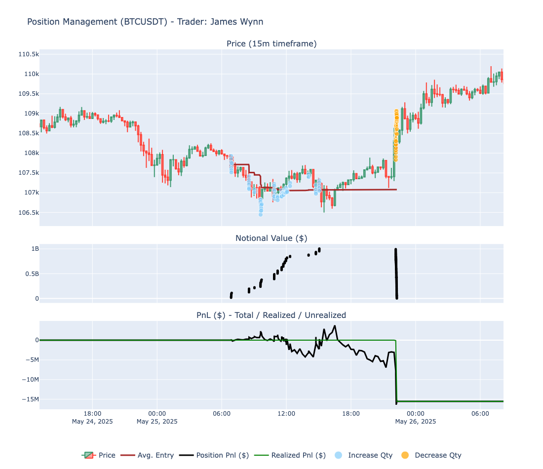 The first of these was a short entered on May 25 around $107.7K. Wynn quickly scaled the position to $1 billion in notional value, anticipating a breakdown. However, when $BTC failed to breach the $106.5K level and instead reversed sharply toward $109K, Wynn was forced to close the trade, realizing a $15 million loss.