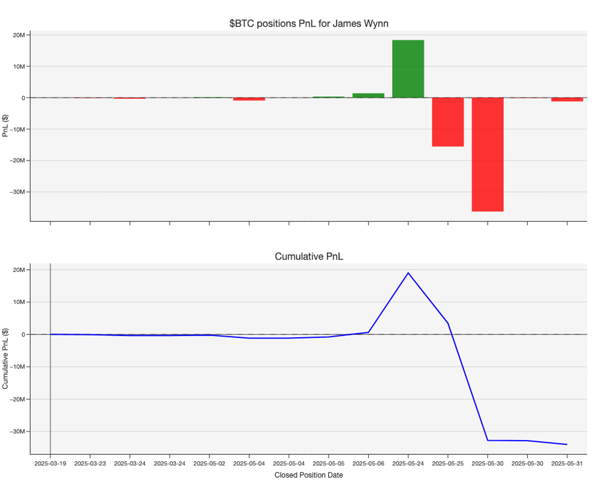 And now we arrive at the $1 billion bet that brought Wynn widespread attention. As previously noted, he had been trading $BTC since late March, but it was in the final stretch, between May 6 and May 31, that he significantly ramped up his exposure with five major positions. Unfortunately, only the first of these five positions was profitable, netting $18 million. The remaining four resulted in a combined loss of $52.2 million, bringing his total PnL on $BTC to approximately -$35 million.