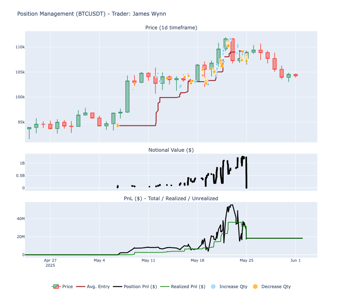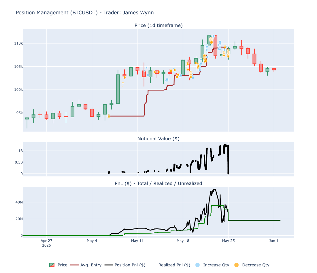 The PnL curve highlights the effectiveness of this strategy during the first part of the trade. Between May 8 and May 22, total PnL increased significantly, peaking at over $55 million. Wynn took partial profits along the way, as shown by the realized PnL (green line), confirming that he was de-risking as the position grew. However, from May 22 onward, the PnL line became increasingly volatile and began to drop sharply, as $BTC lost momentum and started trading below Wynn’s average entry, which had risen to around $109K. On May 24, Wynn started aggressively closing the position for a final realized PnL of $18 million.