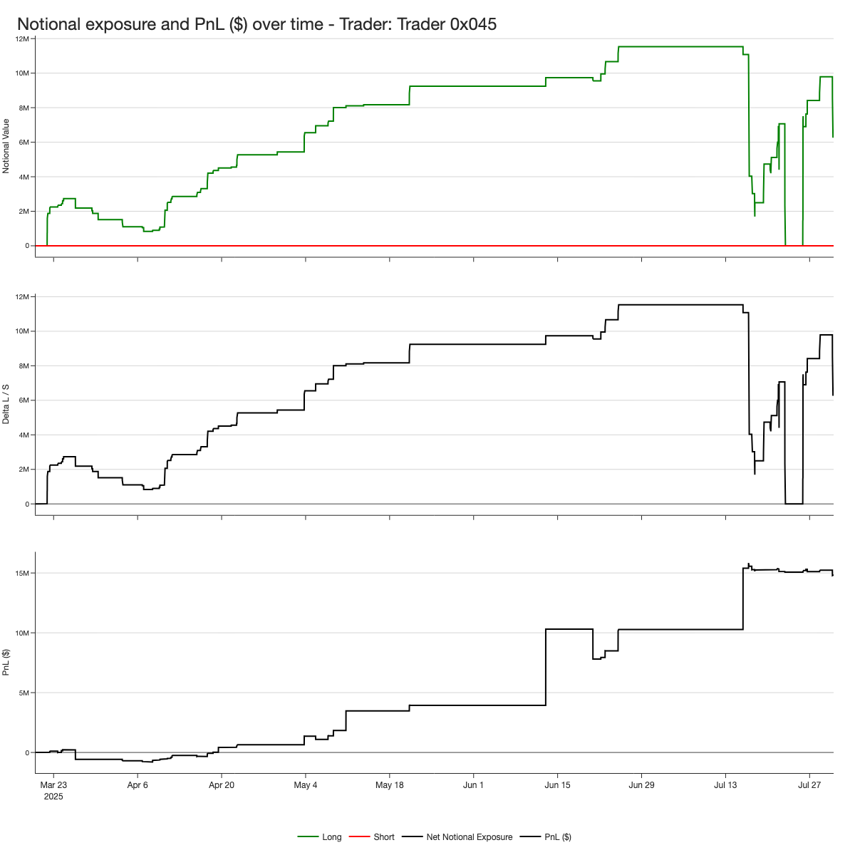 To understand 0x045’s July performance, it’s necessary to look back to late March, when he opened a long position on $HYPE that remained active for roughly four months. Throughout this period, his positioning stayed firmly long-biased, with notional exposure steadily increasing and peaking just under $12M in July. Aside from a minor initial drawdown, his PnL rose consistently, culminating in nearly $15M in realized gains by month-end.