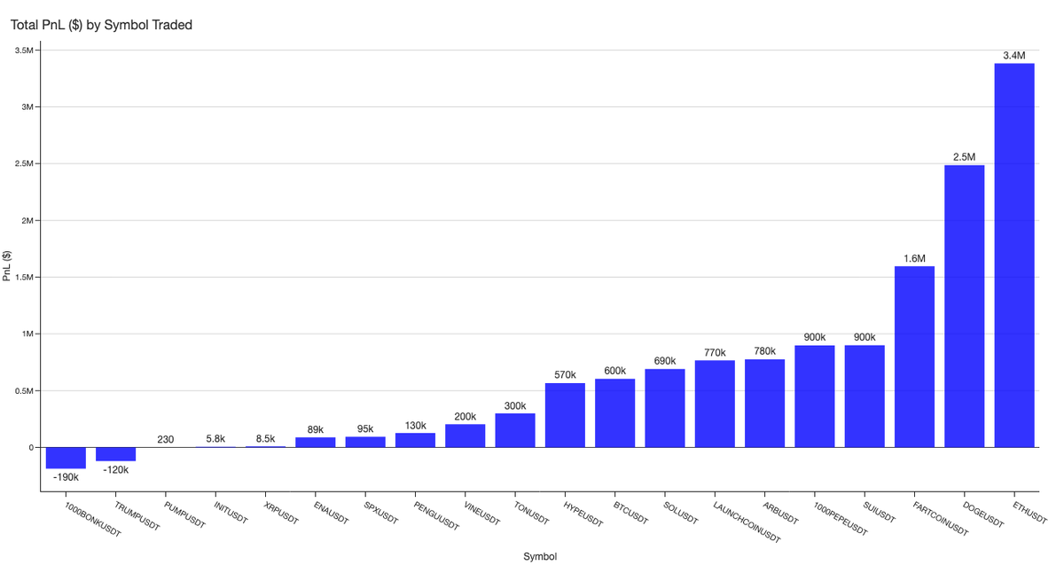 By symbol, 0xtyle traded 20 assets and was profitable in all but two. His top three positions accounted for the bulk of gains: $ETH contributed $3.4M, $DOGE $2.5M, and $FARTCOIN $1.6M, totaling $7.5M, or roughly 57% of his monthly profits.