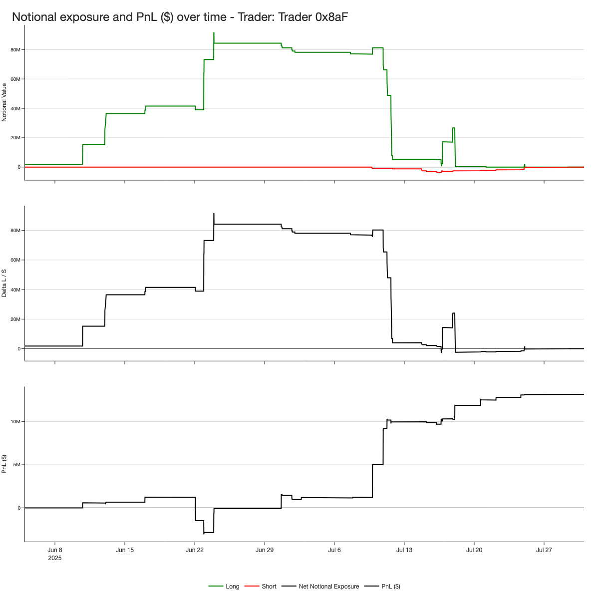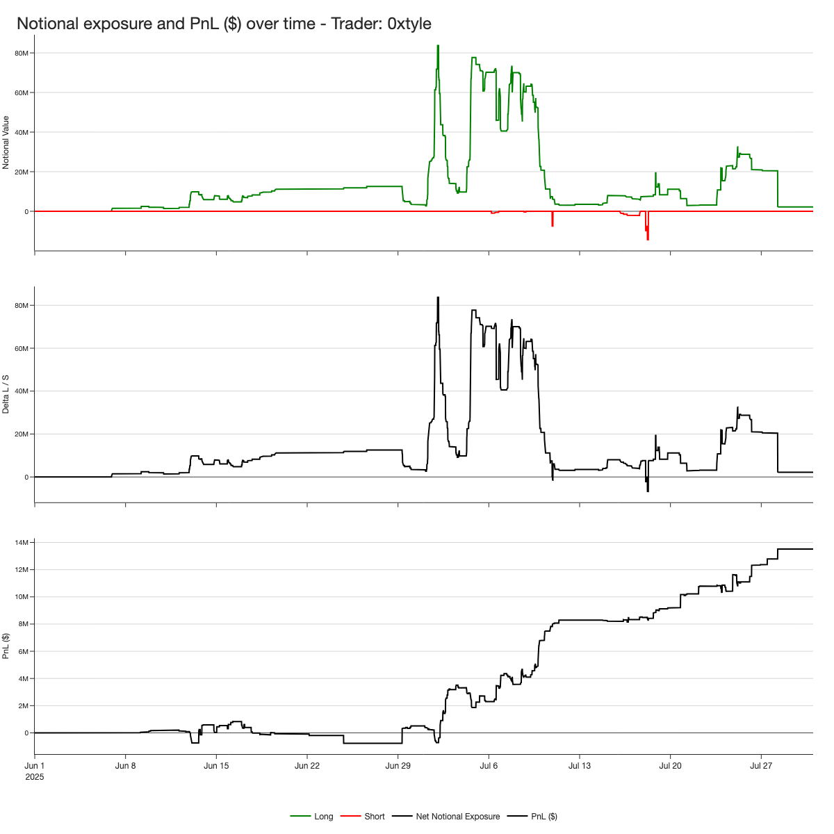 Like 0x045, 0xtyle maintained a predominantly long bias throughout the period. His typical long exposure was around $20M, but between late June and mid-July he scaled it up sharply to over $80M. Most of his profits were generated during this window, moving from near breakeven to +$8M within two weeks, and adding another +$6M over the final 10 days of July.