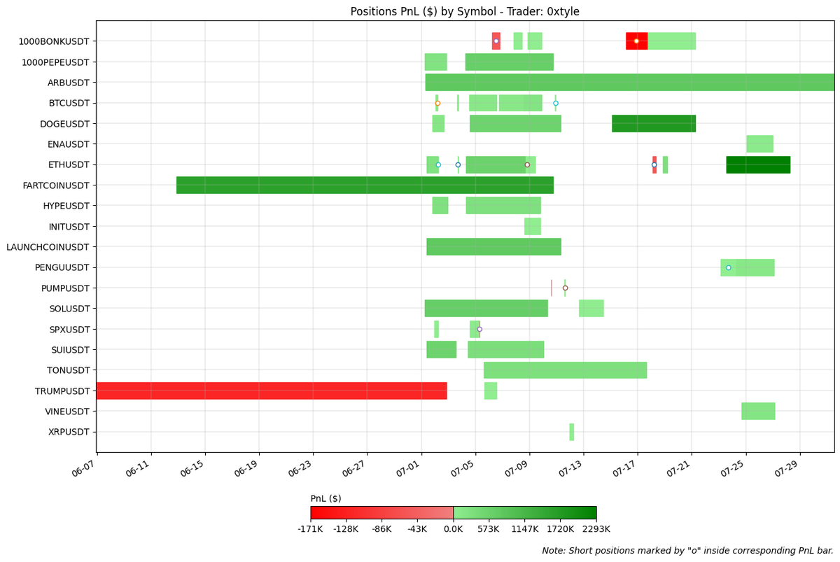 Of the 52 positions closed, 0xtyle traded a mix of major assets and meme-related coins across a range of market capitalizations. As noted, most of his activity occurred in the first half of July, during which he opened multiple positions.