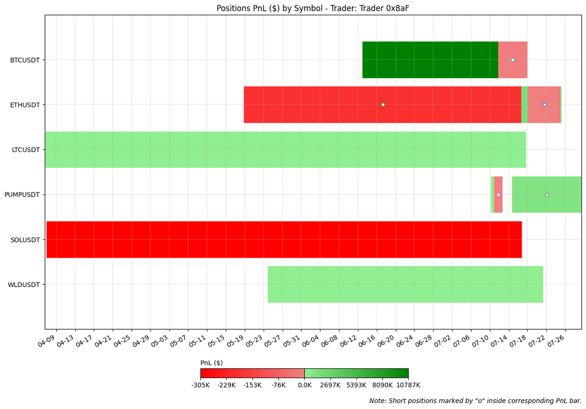 Approximately 83% of 0x8af’s July profits came from $BTC, with the remainder generated by $ETH (+$1.4M) and $PUMP (+$1.1M).