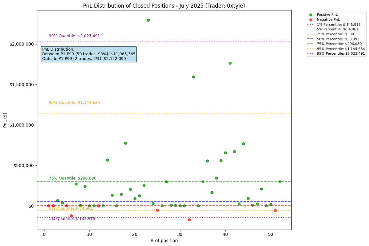 PnL ($) distribution remained strongly positively skewed. The 1st percentile showed a loss of $146k, while the 99th percentile recorded a $2M gain, a 13.8x difference. Consistent with June, the majority of profits came from the bulk of his positions (+$11M from 98% of trades), with the remaining 2% accounting for $2.1M.