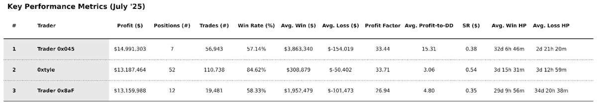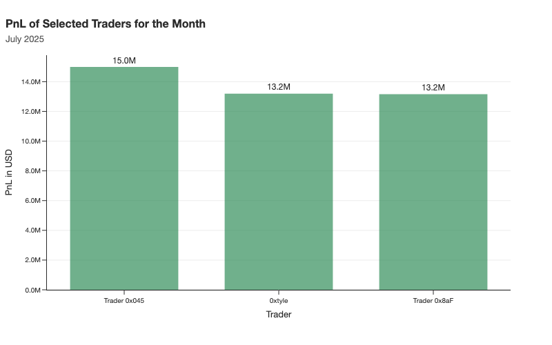 In this context, the top three traders all achieved eight-figure realized profits. Leading the month was 0x045 with $15.0M, followed by 0xtyle with $13.19M and 0x8af with $13.16M. Notably, 0xtyle also ranked among the top performers in June with $7.9M, bringing his two-month total to $22.9M.
