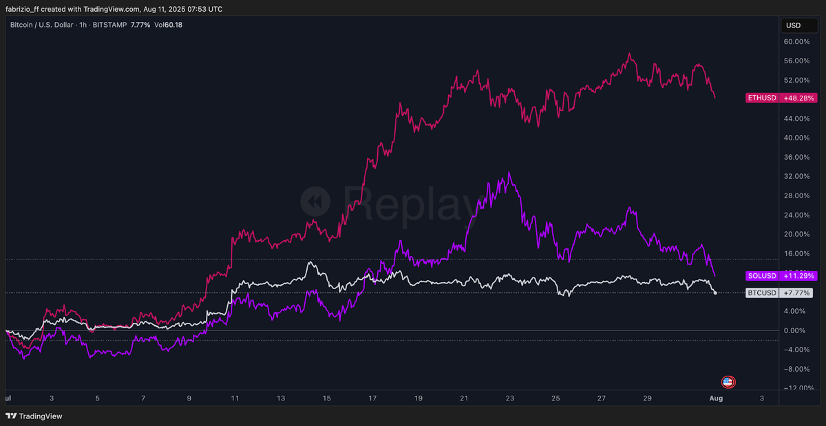 Compared to June, July offered a more favorable trading environment, with a steady upward trend, limited drawdowns, and all major assets closing the month in positive territory. $ETH led with a +48% gain, followed by $SOL at +11.3% and $BTC at +7.8%.