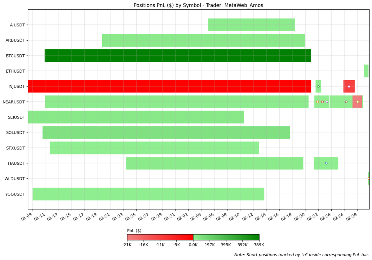MetaWeb_Amos maintained an average holding period of two weeks for his positions, many of which were initiated in mid-January. This trading pattern, as highlighted in our previous analysis, indicates his strategy of relying on a few significant victories to drive the majority of his PnL. This approach was exemplified in February when a single BTC position accounted for 69.8% of his total PnL, translating to +$789k out of $1.06 mln.