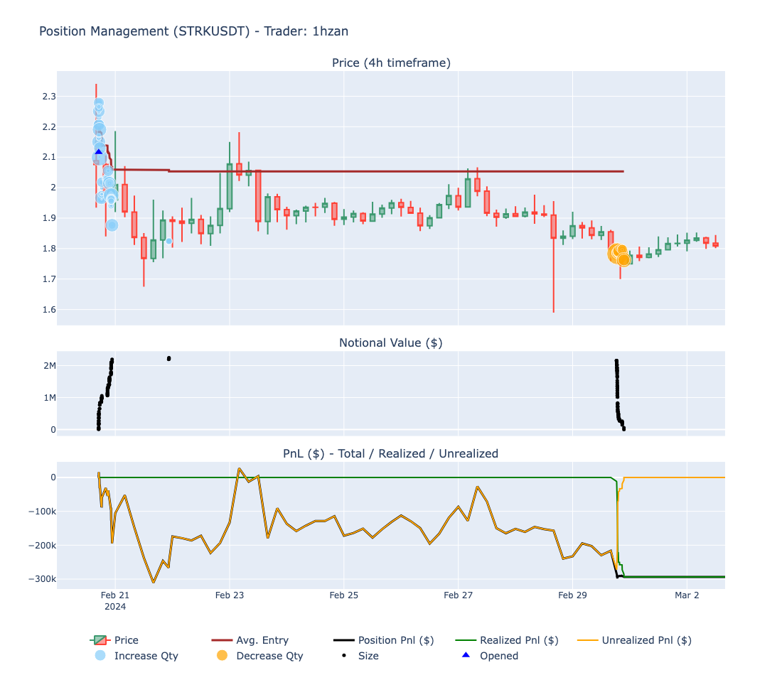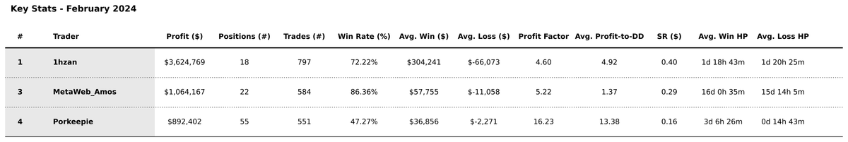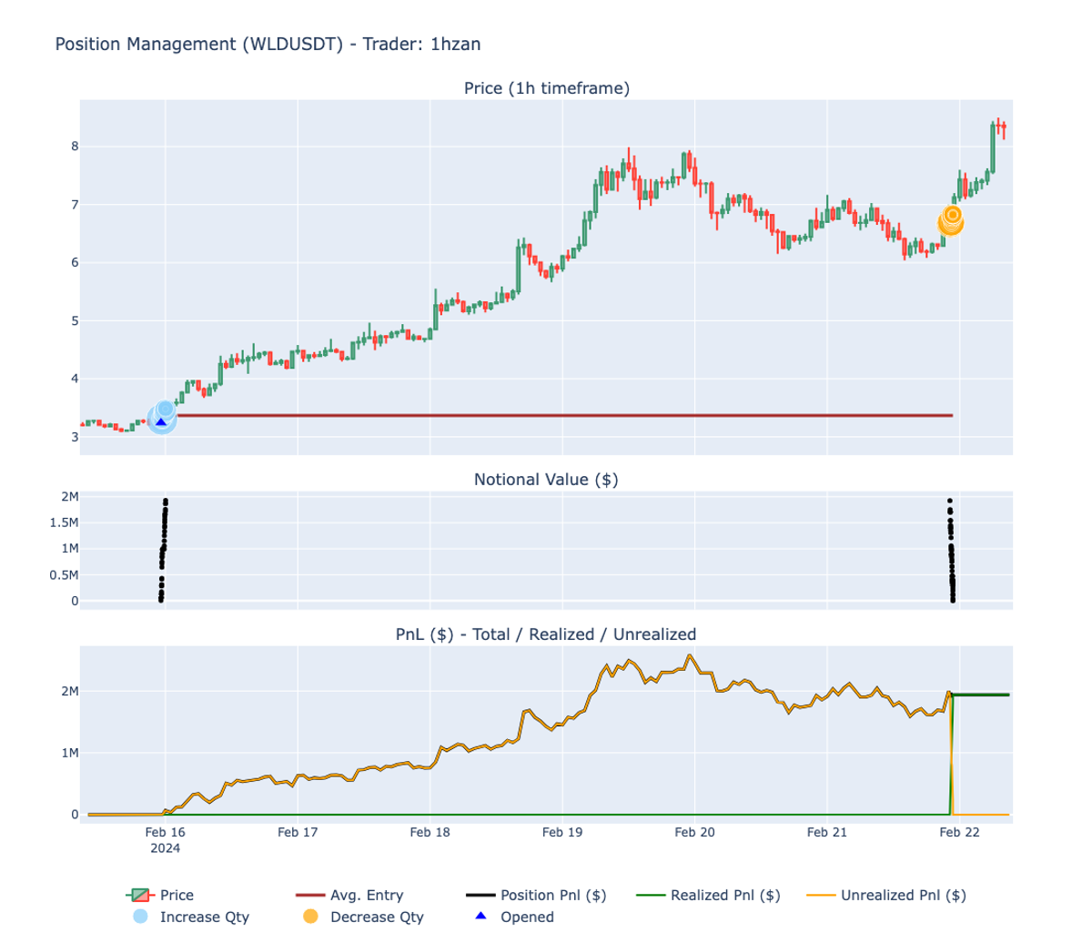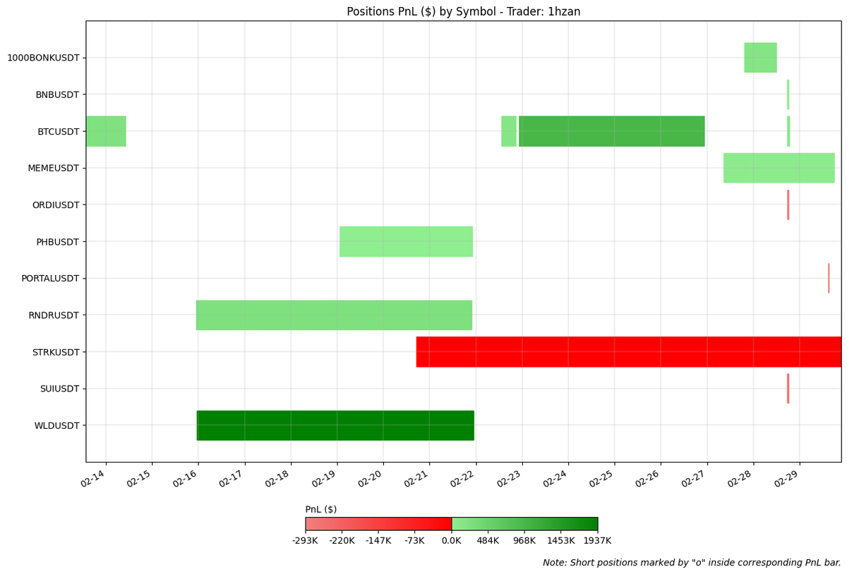 - 1hzan's approach was marked by aggressive trading, with an average holding period of just 2 days, cutting losers fast and letting winners run, allowing him to amass $3.6 million in profits from February 13th onwards. His ability to escalate his account from $300k to nearly $10 million over the month, as showcased on his Twitter profile, speaks volumes about his risk-taking capacity and use of leverage.