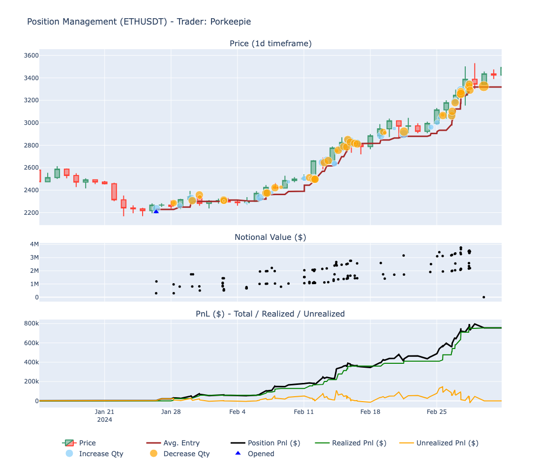 - Despite closing 55 positions in February, Porkeepie's standout trade was in Ethereum, yielding a profit of $755k from a total of $892k. This trade not only significantly contributed to his PnL but also highlighted his exceptional skill in position management, particularly in terms of scaling in and out to maximize gains and minimize risk.