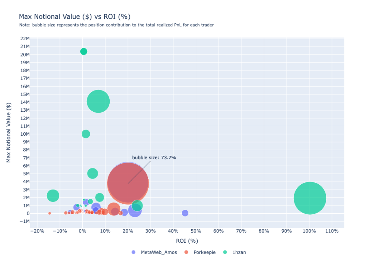 The figure below displays a bubble chart comparing the maximum notional value ($) and ROI (%) for each trader's positions. The size of each bubble indicates the contribution of that position to the trader's total realized PnL. For instance, one of Porkeepie's positions, as highlighted, had a maximum notional value of approximately $3.77mln, a 20% ROI, and contributed 73.7% to his total PnL.