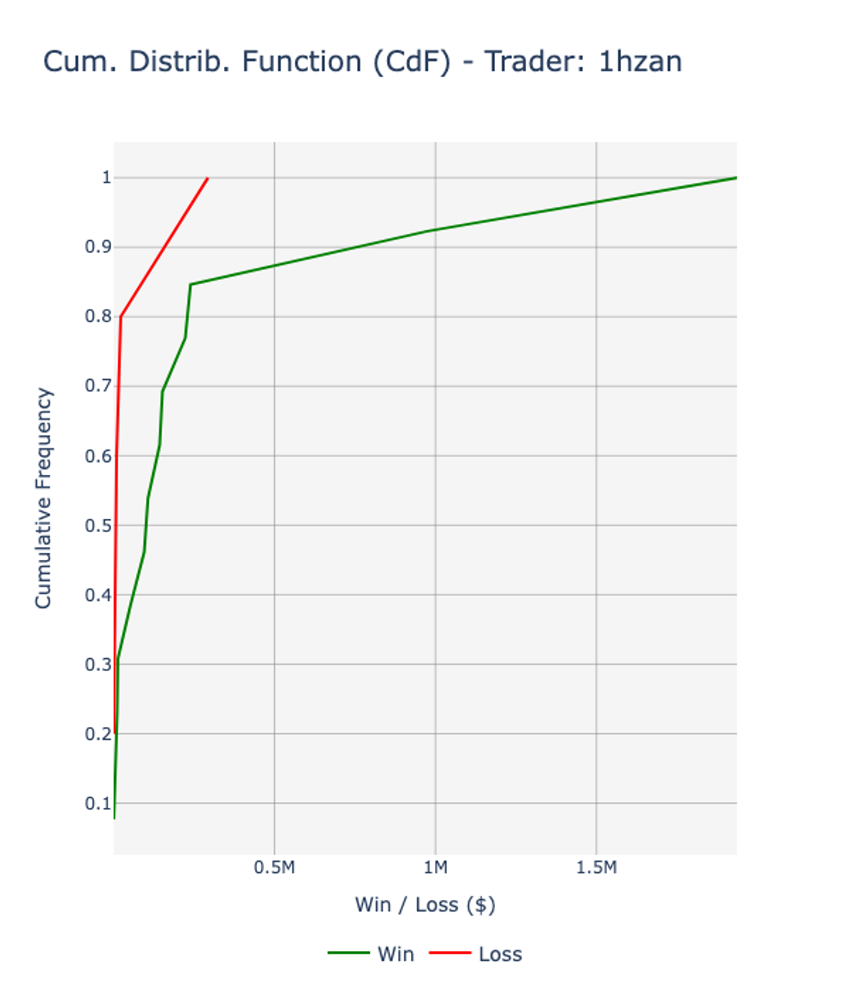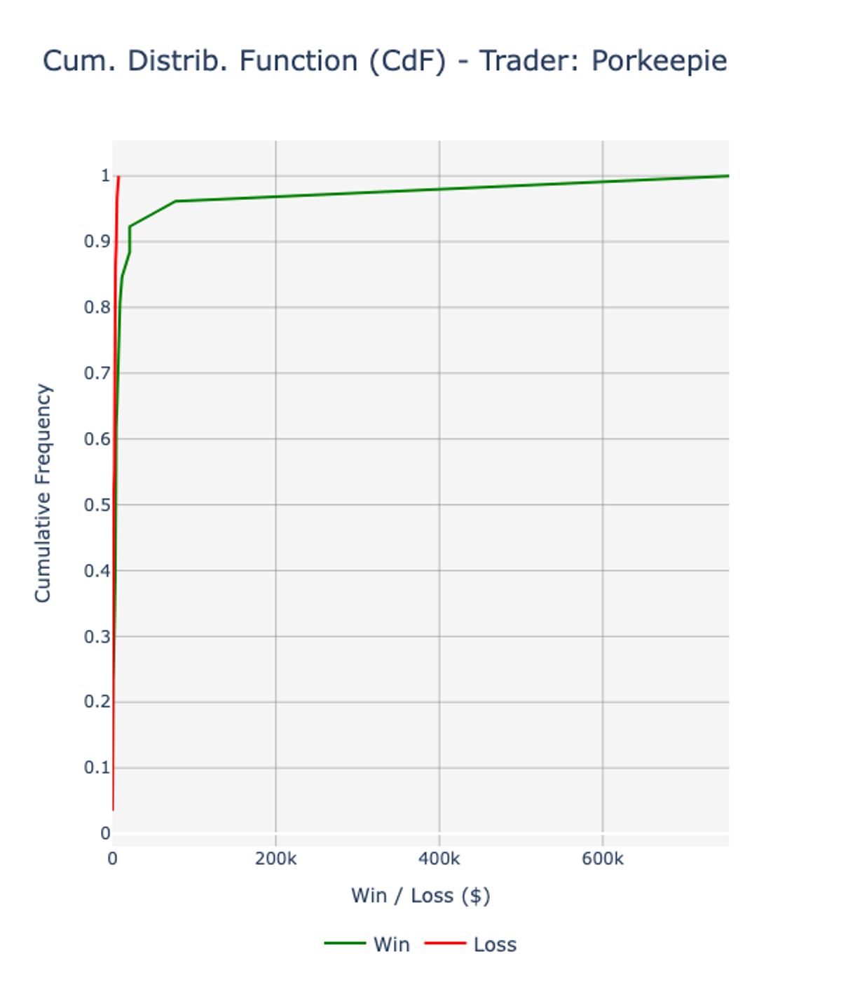 The cumulative distribution function (CdF) of his PnL is positively skewed (skewness: 2.68), with a strong positive edge since lower percentiles: