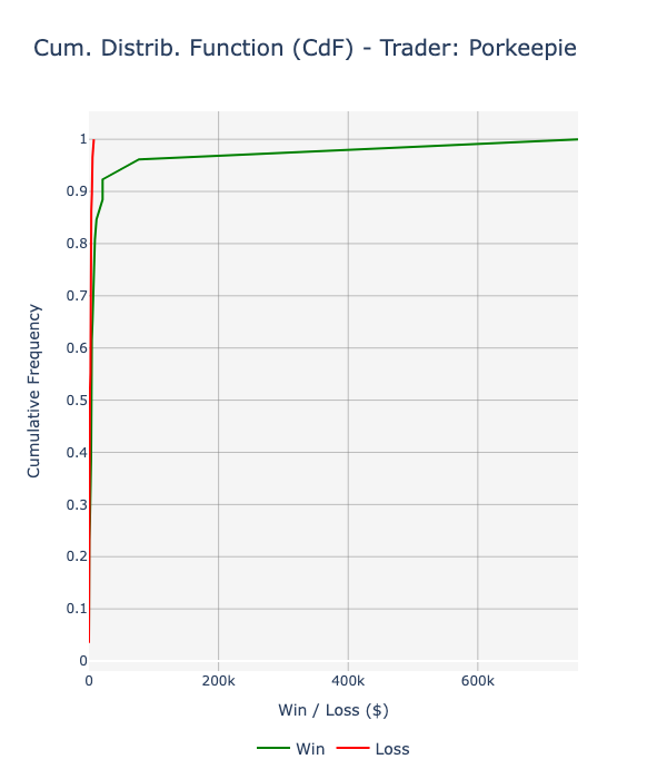 - The disparity in Porkeepie's PnL distribution is striking, with his maximum loss capped at $8k against a staggering maximum profit of $755k from the ETH position. The cumulative distribution function (CdF) of his PnL is positively skewed (skewness: 7.1), with a positive edge since lower percentiles: