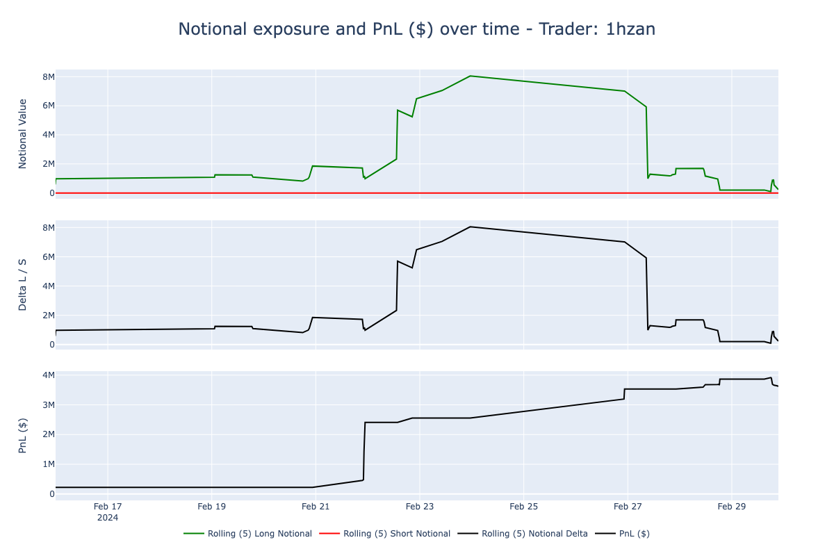 Throughout the month, his average notional hovered just below $2 million, however, it was between February 22nd and 27th that 1hzan significantly increased his market exposure, elevating his average notional size to around $8 million.