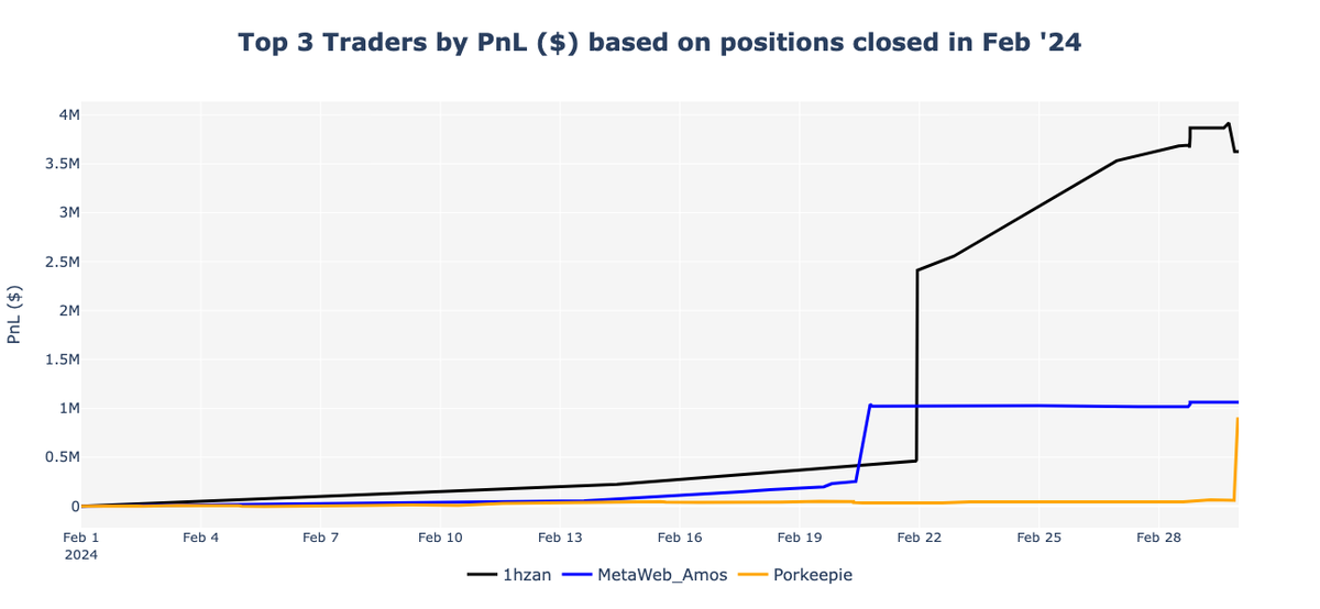 His PnL trajectory was relatively flat at the start of February but saw a consistent upward trend towards the month's close, moving from nearly zero to $1 million without encountering significant drawdowns.