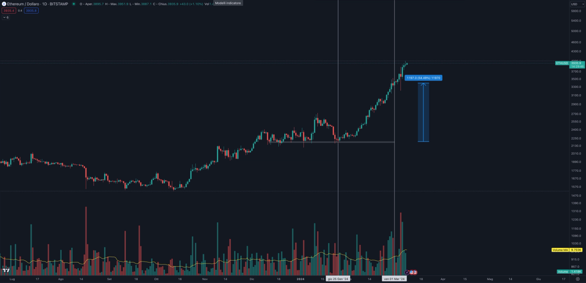 This position management allowed him to incrementally lock in profits while adjusting his average entry price upwards from $2,200 to $3,300. The skillful balance of expanding his investment during downturns and securing gains on the uptrend underscores the sophisticated approach he took.