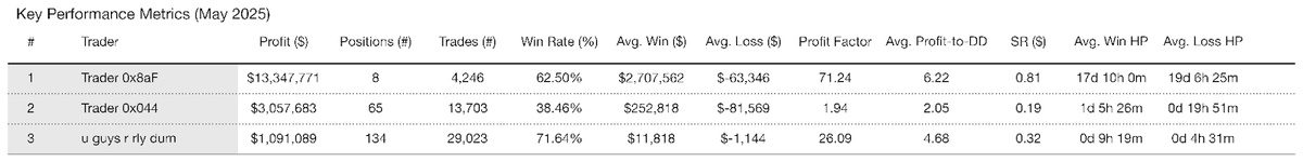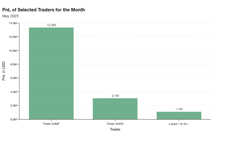 The three traders featured in this report were selected based on multiple criteria and performed well in these favorable conditions. 0x8aF stood out with a profit of $13.3 million, significantly outpacing the other two. 0x044 and “u guys r rly dum” followed with gains of $3.1 million and $1.1 million, respectively.