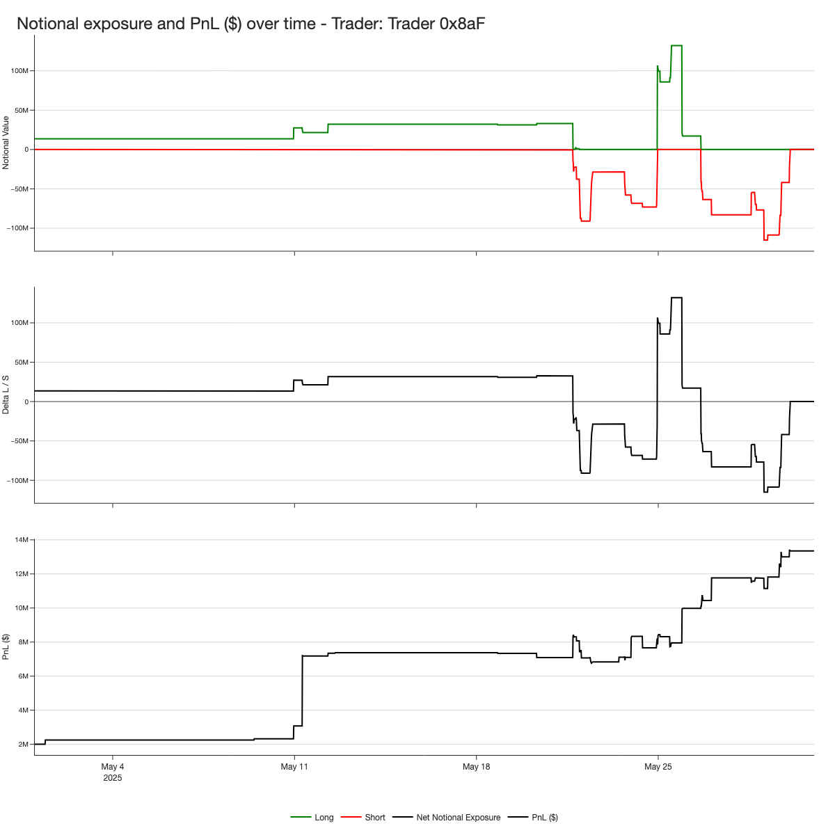 0x8aF maintained a predominantly long exposure throughout the month, with two brief exceptions during the final 10 days. His PnL curve shows that the bulk of his profits, around $8 million, were realized on May 11. After a relatively flat period, he secured the remaining gains by May 26, ending the month with a total profit of $13.3 million. In terms of notional exposure, he stayed below $50 million during the first half of the month, before ramping up to over $100 million in both long and short positions later on.