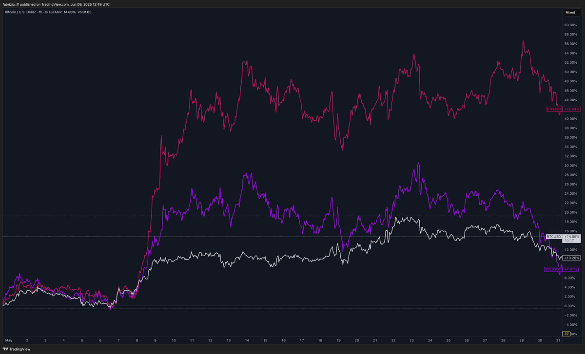 May was a strong month for the crypto market. Among major assets, $ETH led the gains with a +40% increase, followed by $BTC up 10.3%, which also printed its highest monthly close ever at $104.6k, and $SOL, which ended the month up 7.8%.