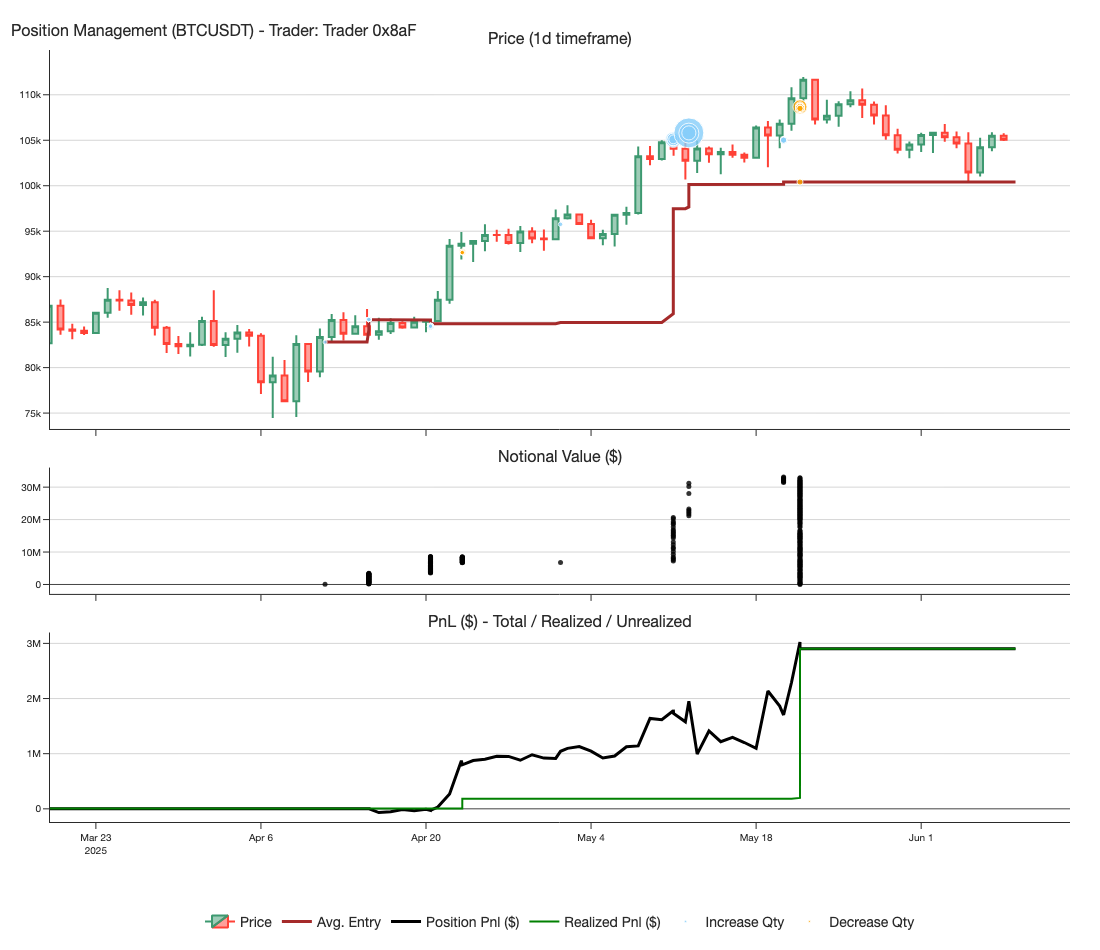 Instead of taking profits when up $2 million, 0x8aF tripled down, increasing his exposure to over $30 million, likely anticipating a breakout on this third attempt. The breakout materialized a few days later, with $BTC reaching a high just above $110k. At that point, he closed the position, locking in a total profit of $2.9 million.