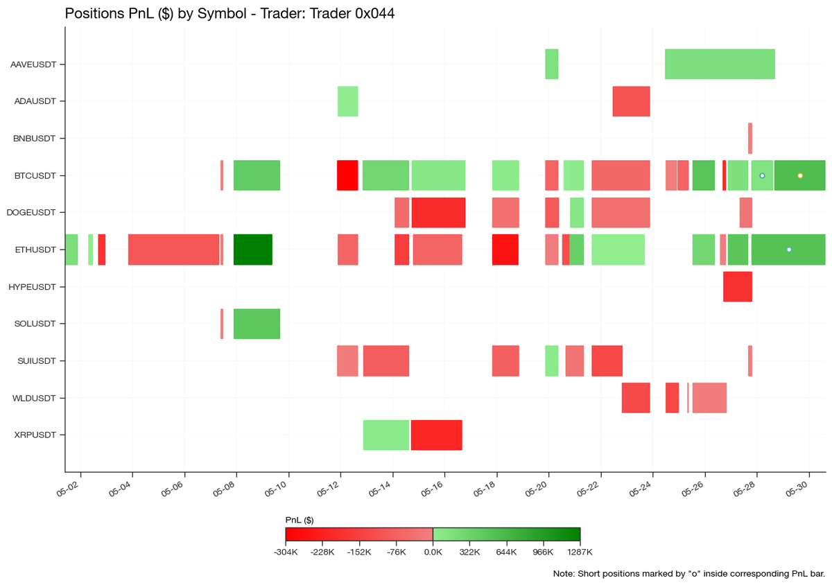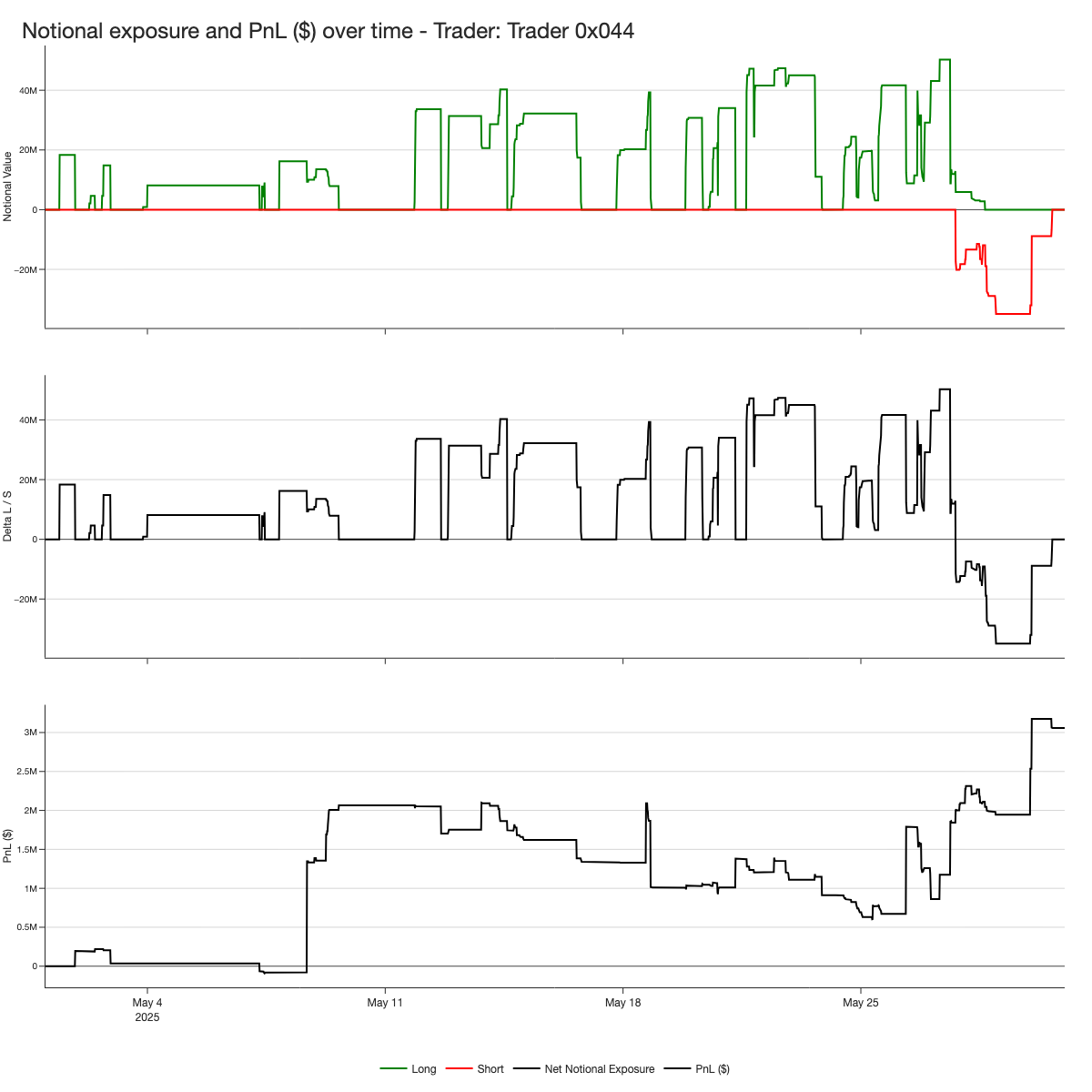 0x044 maintained a long bias for most of the month, except during the final week of May when he shifted to the short side. His notional exposure fluctuated between -$40 million and +$40 million, with frequent entries and exits indicating a highly active trading style.