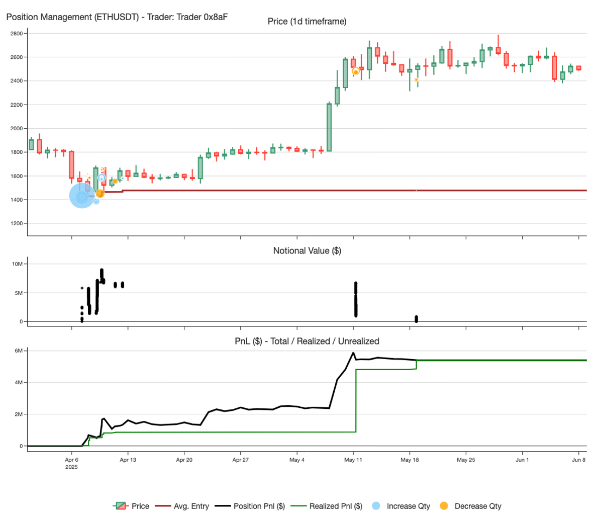 0x8aF entered the position on April 7 at $1,465, likely anticipating it as a key support level for $ETH, with an initial size just above $5 million. Over the following 4–5 days, he partially reduced the position, realizing $500k in profits.