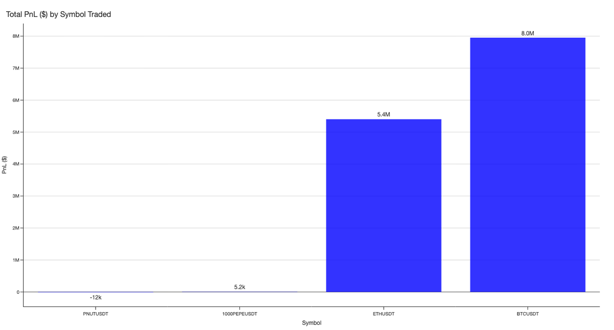 His PnL by symbol speaks for itself: nearly 100% of his total profits came from the majors, with $8 million gained from $BTC and $5.4 million from $ETH.