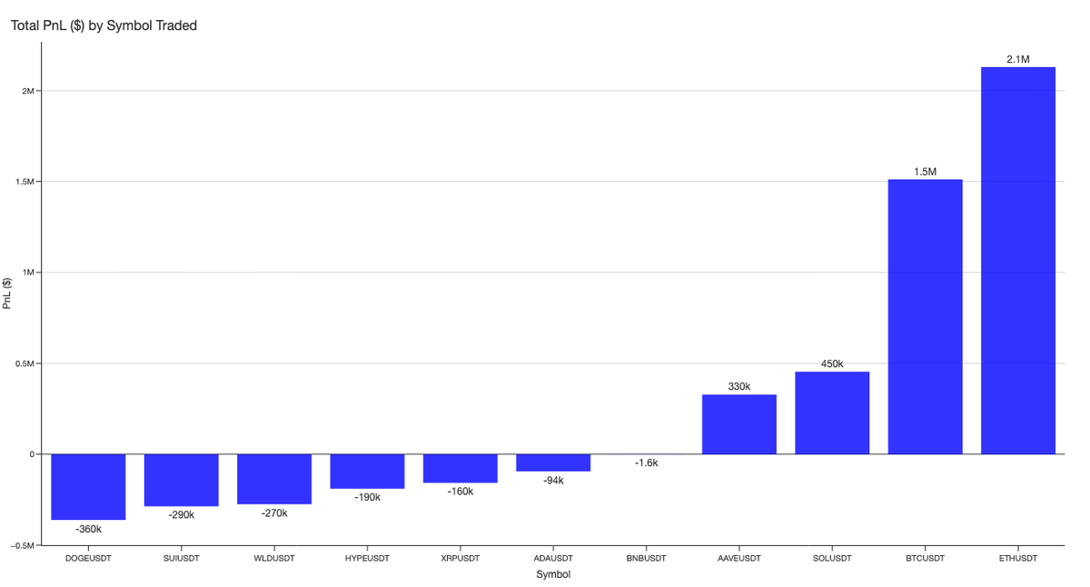 $BTC and $ETH accounted for total profits of $3.6 million, followed by smaller gains from $SOL and $AAVE. The remaining symbols were traded at a loss, with the largest loss coming from $DOGE at -$360k.