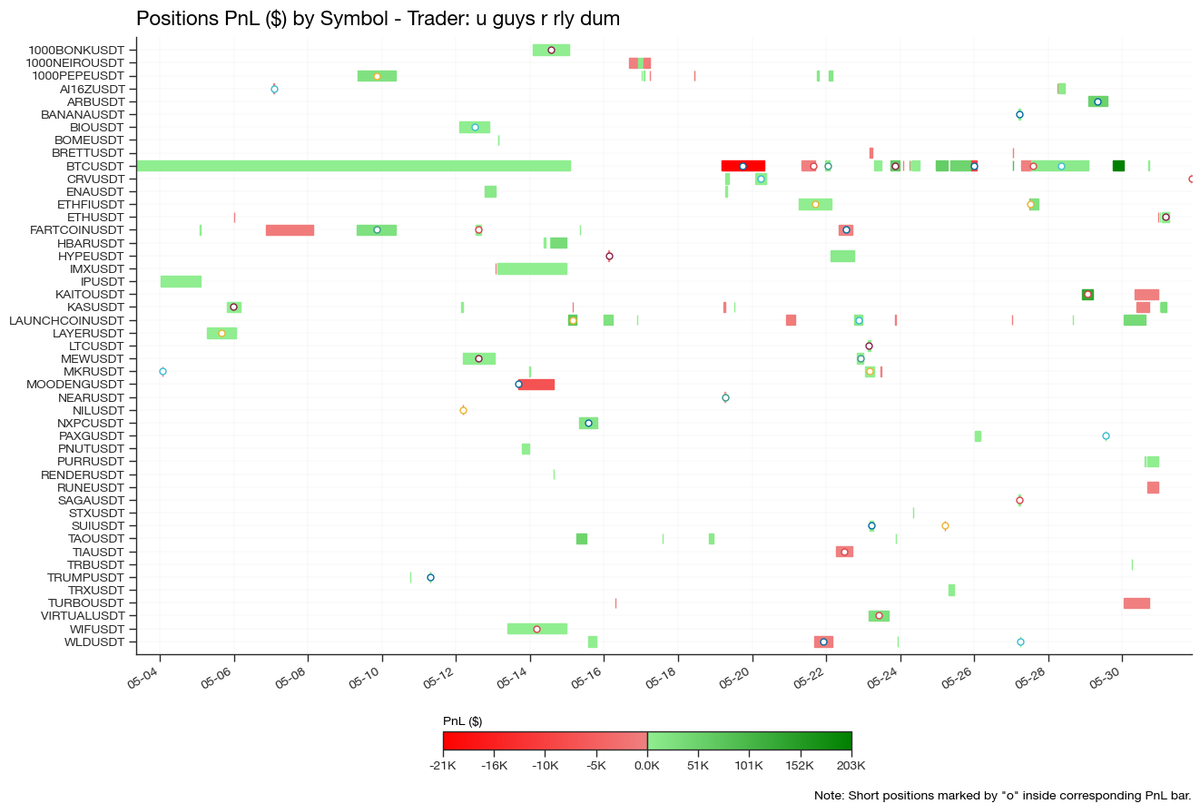 “u guys r rly dum” closed 134 positions in May, with an average holding period of approximately 9 hours for winning trades and 4 hours for losing ones. Unlike the two previous traders, he frequently switched between long and short positions, with a less consistent directional bias.