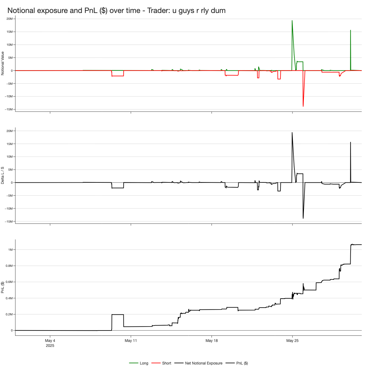 His exposure varied significantly, from as low as $500k to typical sizes around $2 million, and in two extreme cases, between $15–20 million. Despite these rapid and sizable shifts in exposure, his PnL curve was the cleanest of the three, steadily trending upward throughout the month with minimal drawdown.