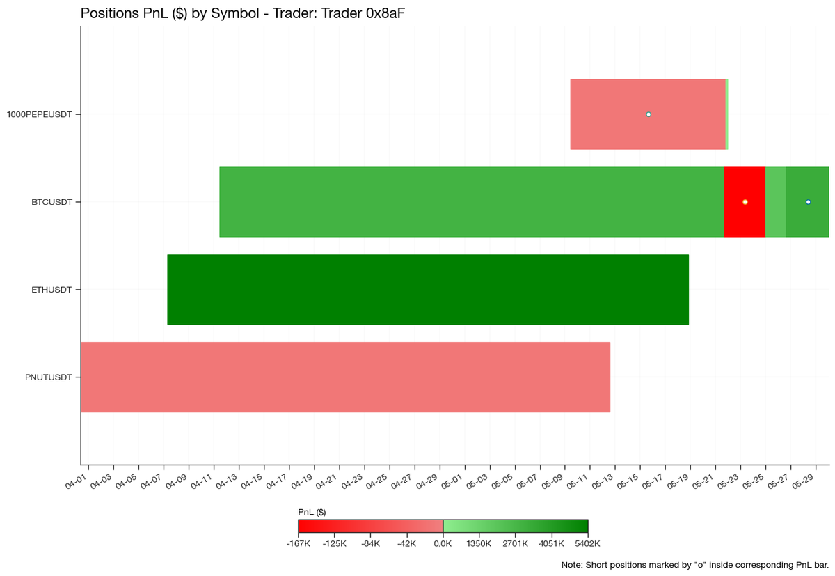 Out of the 8 positions closed, he traded 4 different symbols, two majors ($BTC and $ETH) and two meme coins ($PEPE and $PNUT), with the majority of his activity concentrated on $BTC and $ETH.