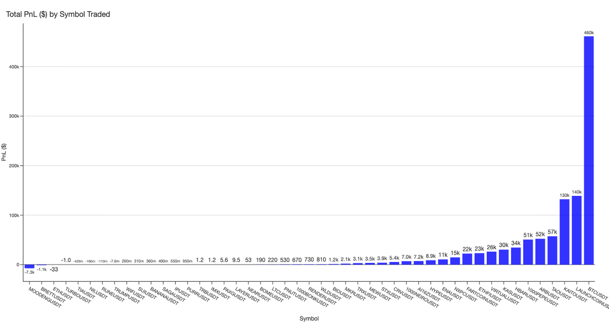 Despite the large number of symbols traded, $BTC gains of $460k accounted for nearly 42% of his total profits. He was profitable on most of the symbols he traded, with the largest loss coming from $MOODENG at just -$7.3k, insignificant compared to his wins.