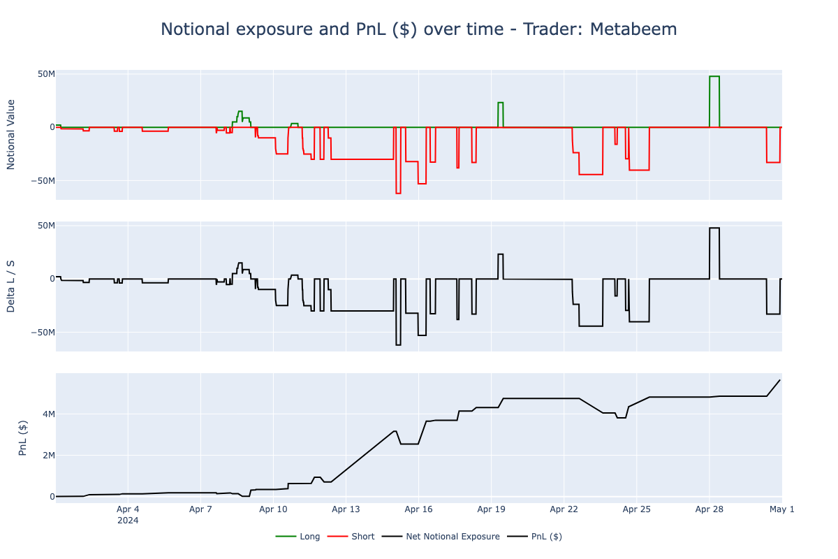 Metabeem’s trading activity in April 2024 was predominantly short-biased, maintaining short positions for the majority of the month (85% shorts out of 46 positions). This trader’s strategy involved substantial position sizing, with notional values fluctuating between -$50 million and +$50 million.