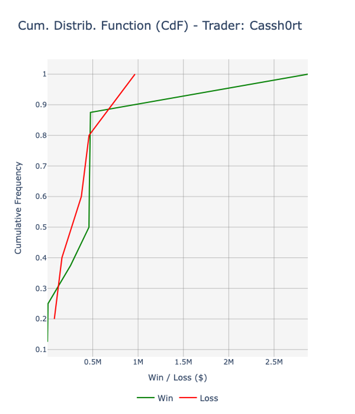 The cumulative distribution function (CdF) of his PnL is positively skewed (skewness: +0.79), with a positive edge since lower percentiles: