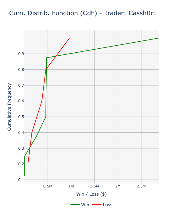 - Cassh0rt’s notional exposure fluctuated between -$17 million and +$21 million. Like Metabeem, he frequently shifted his positions between long and short without ever hedging his portfolio. The figure below displays, for each closed position in April ‘24, the PnL ($) by symbol traded and their holding period. The figure below displays the TotalPnL ($) by symbol traded. The cumulative distribution function (CdF) of his PnL is positively skewed (skewness: 1.9), with a positive edge since lower percentiles, with one exception between 80th and 90th::
