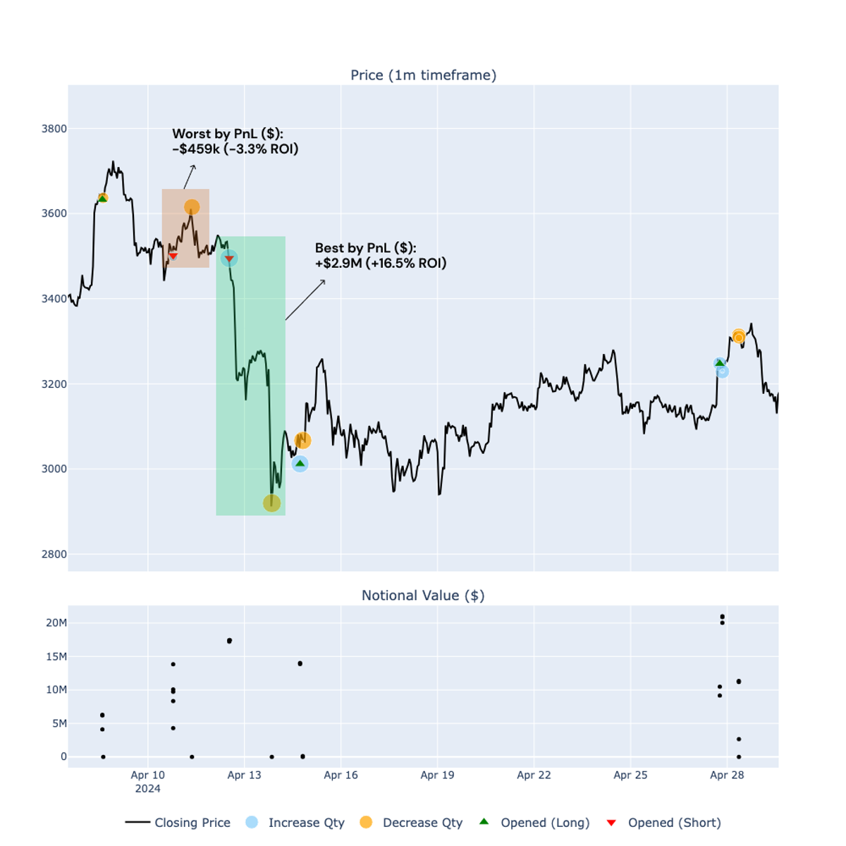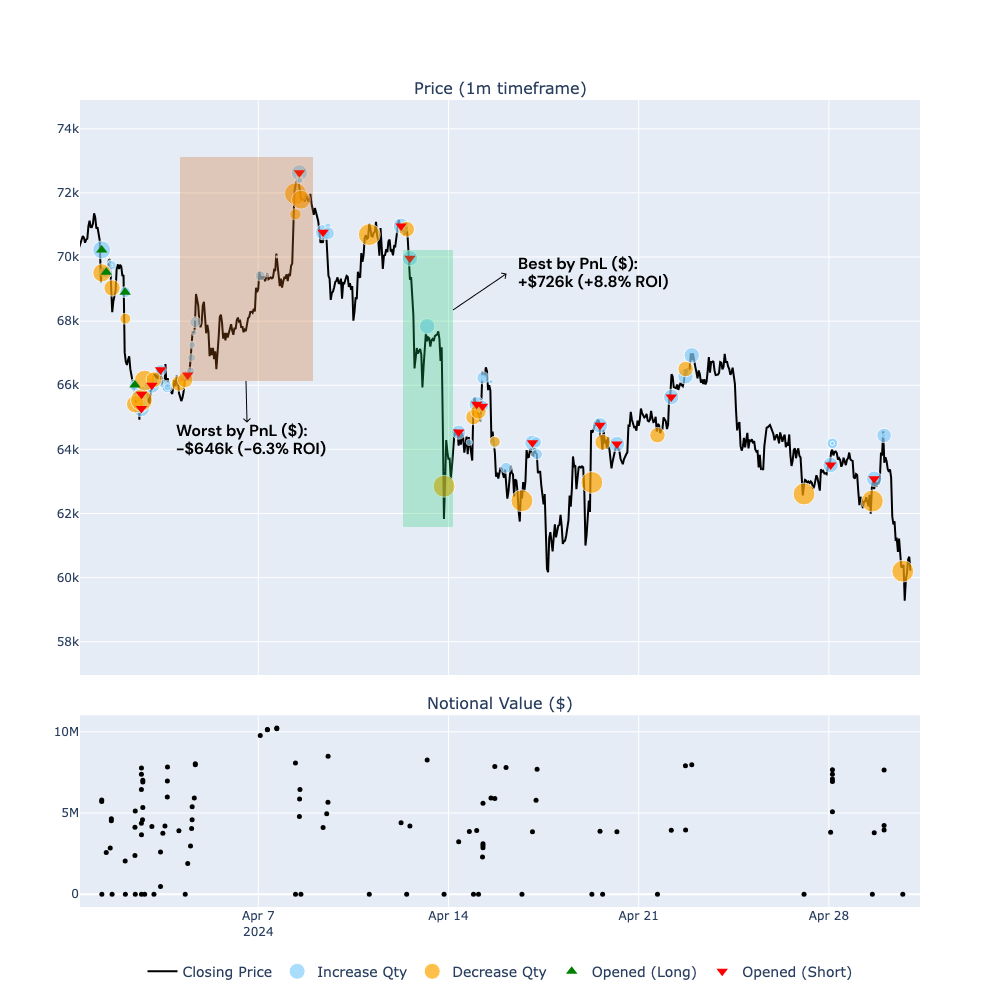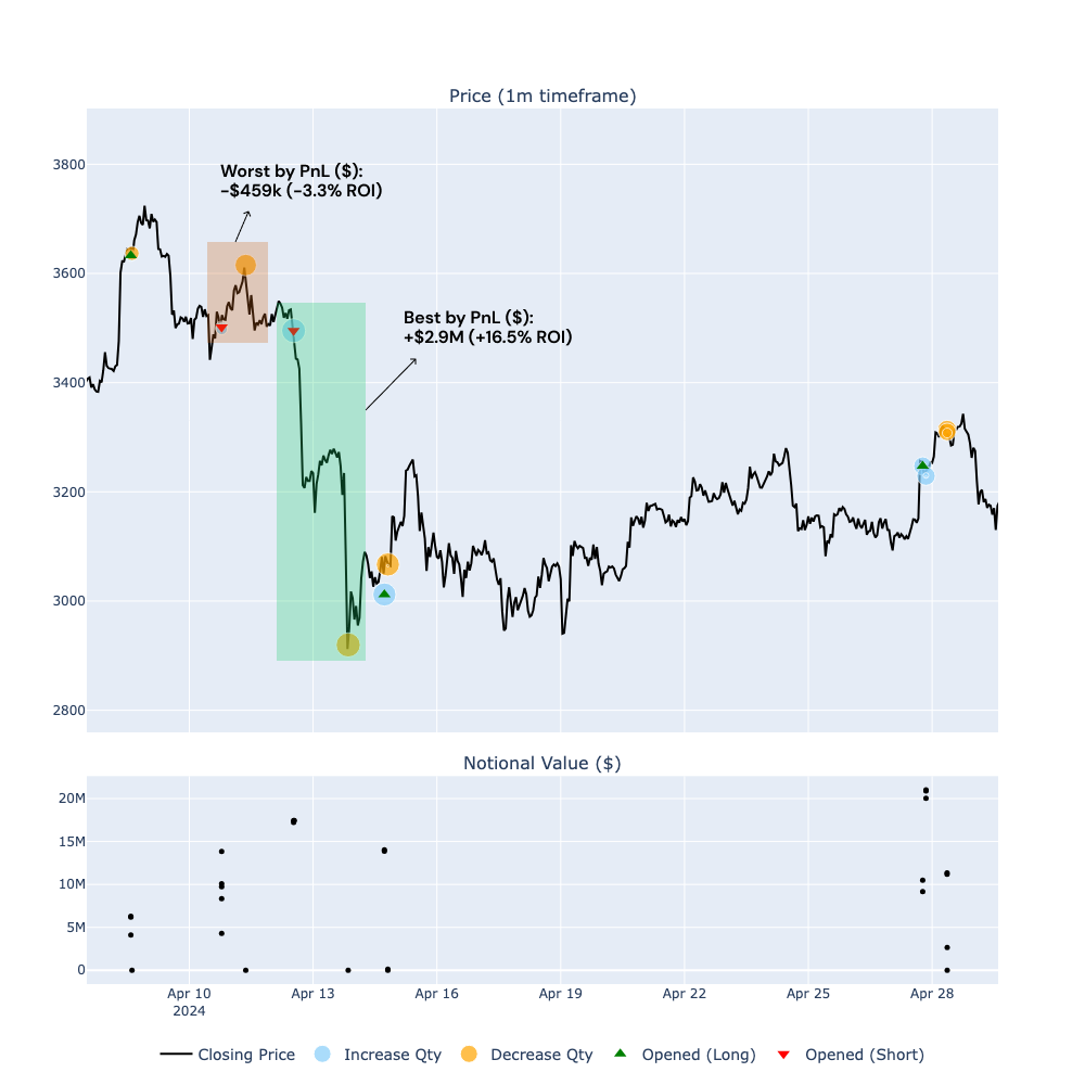 - Conversely, the worst trade by PnL (highlighted in red) resulted in a loss of $316k, although with a ROI of just -1.3%, however with a notional size of $23.8 million. This analysis underscores the importance of position sizing and conviction in a trade to achieve impactful profits. As recently highlighted by @JoshuaDeuk in a tweet (https://x.com/JoshuaDeuk/status/1791677487216509414), having strong conviction and appropriate sizing in trades can make a significant difference in overall performance: