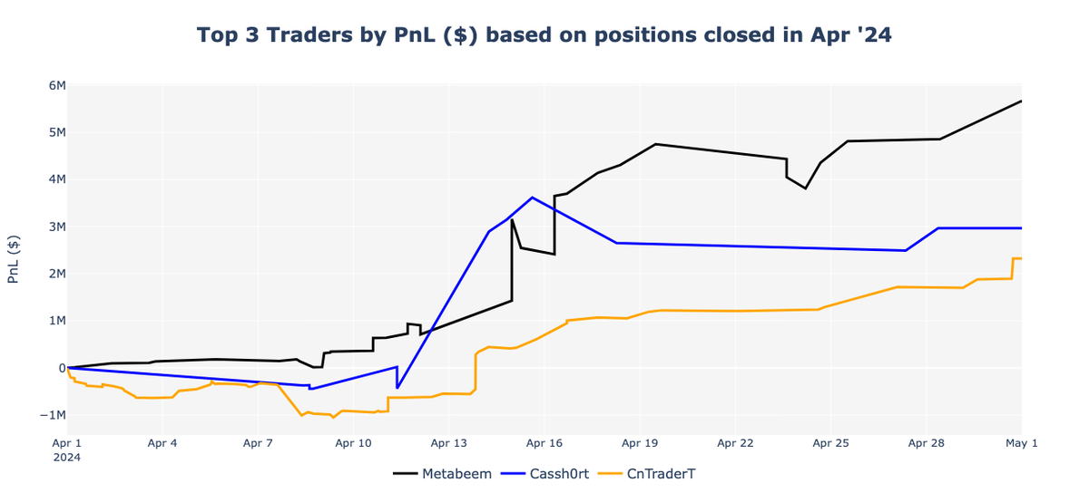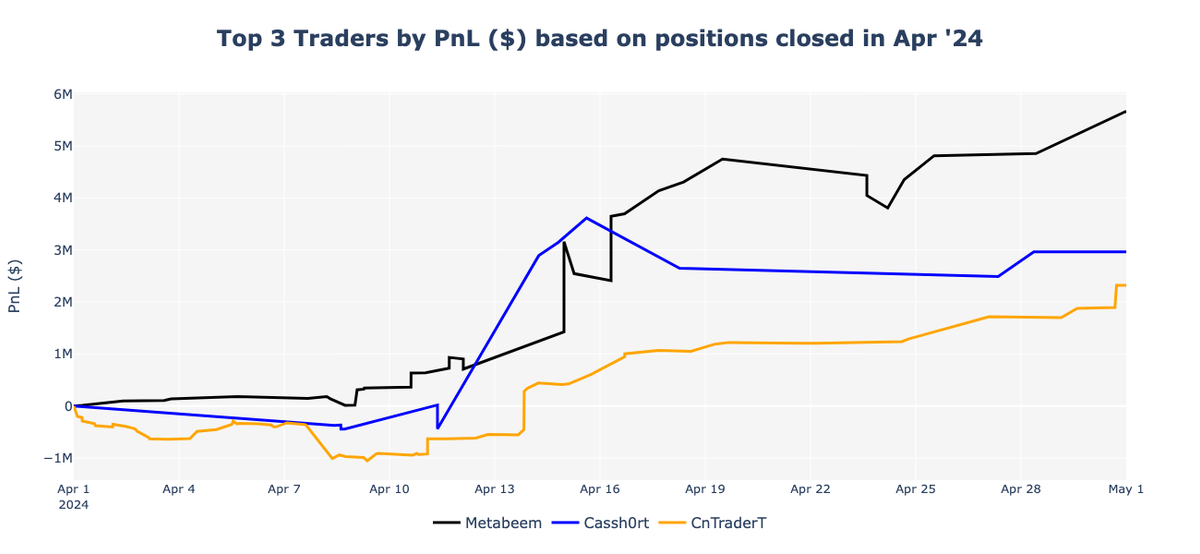 In first place, much like the previous month, Metabeem exhibited a consistent upward trend throughout April, surpassing the $5 million mark and closing the month with a total profit of $5.7 million. Cassh0rt, in second place, saw their PnL curve rise sharply after April 10th, peaking at almost $4 million before closing the month with a notable profit of approximately $2.9 million. Finally, CnTraderT, same place as previous month, experienced a gradual and steady increase in PnL. Despite starting with a slight dip into negative territory early in the month (-$0.9 million), this trader’s PnL consistently climbed, closing around $2.3 million.